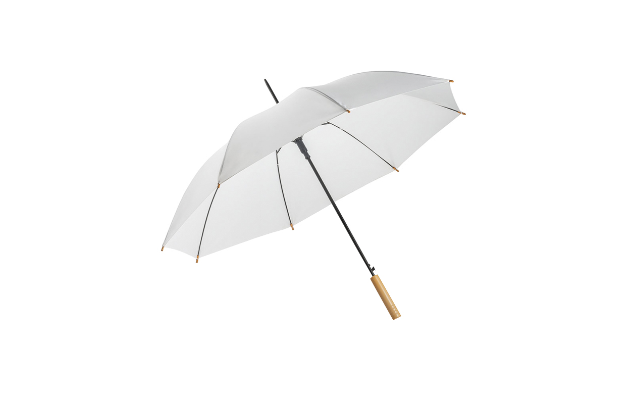 Paraguas de 8 gajos con tela impermeable de rPet (plástico reciclado). Con mango de madera, y estructura y puntera metálicas. Con mecanismo de apertura automática.*La tonalidad del color del mango de madera puede variar según la partida.