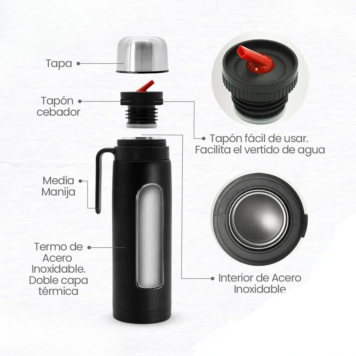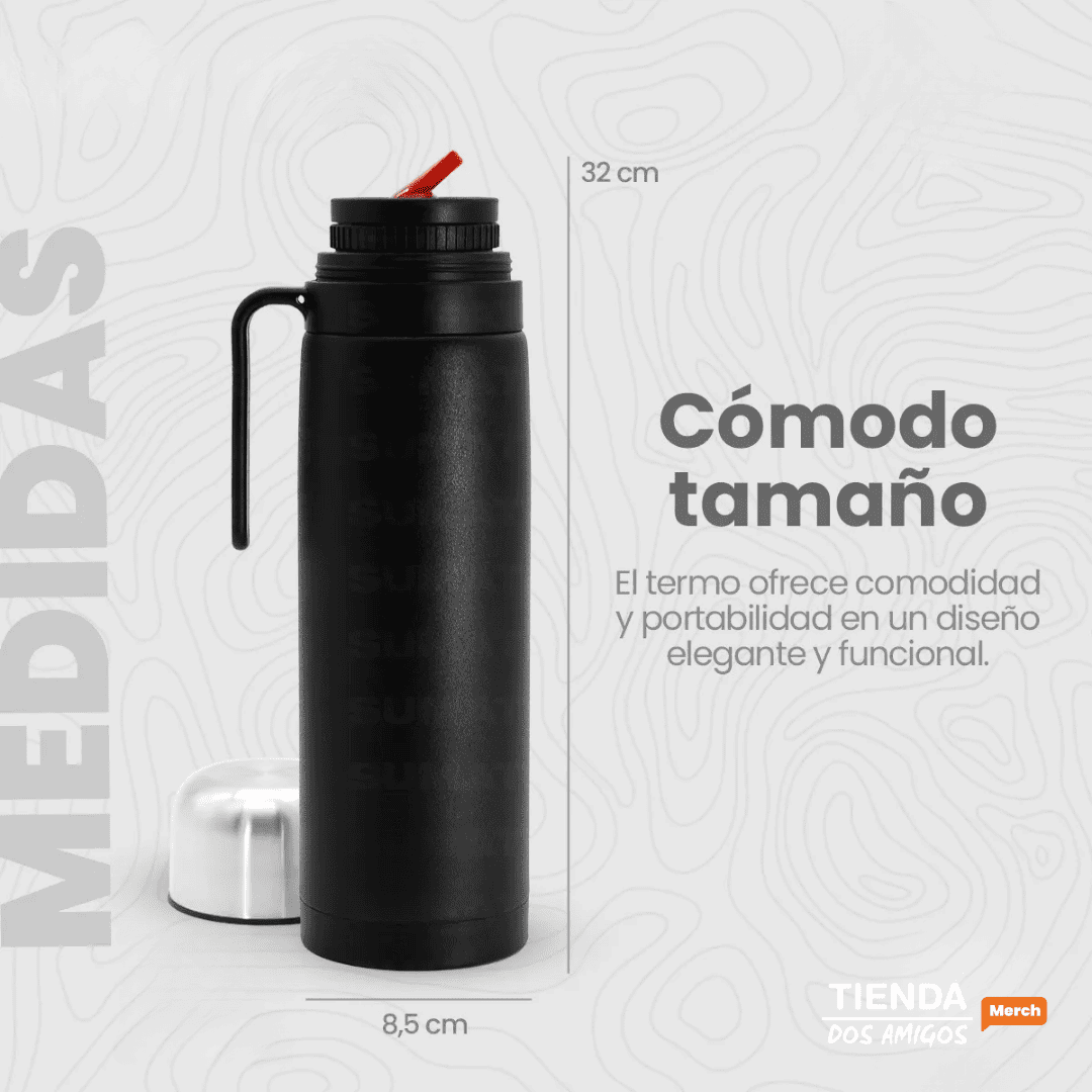 - Material: Acero Inoxidable con doble capa térmica. Conserva la temperatura por más tiempo.